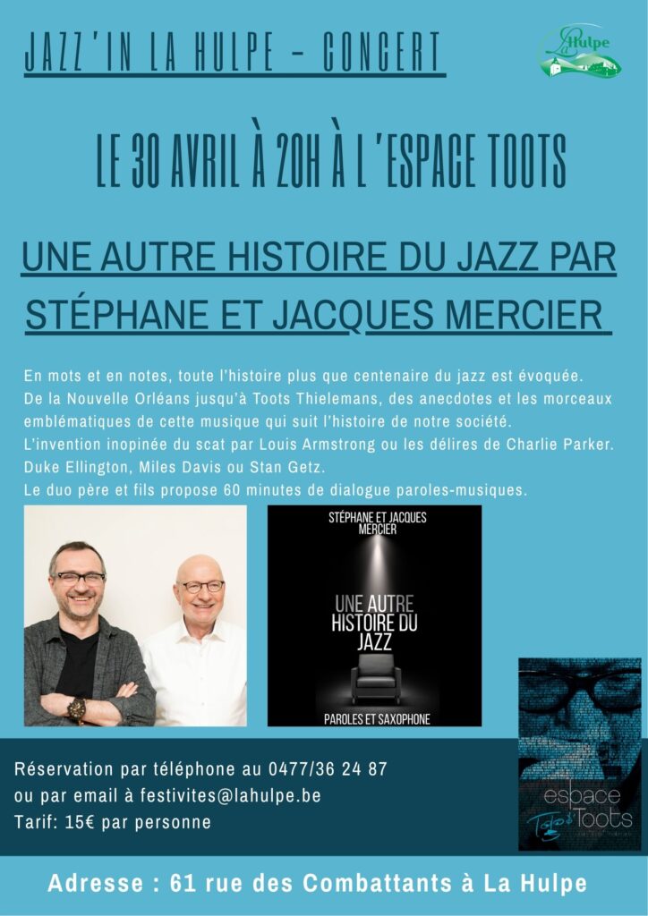 Avec mon fils Stéphane, au sax, je raconte Une autre histoire du jazz au fil de courtes anecdotes. Comme le public est ravi, nous le sommes d’autant plus ! Vous reconnaîtrez les mélodies, vous sourirez aux mésaventures des jazzmen, vous serez émus par vos souvenirs mêlés à cette musique si vivante. Le prochain spectacle se tient le vendredi 30 avril à 20h à l’Espace Toots Thielemans à La Hulpe.